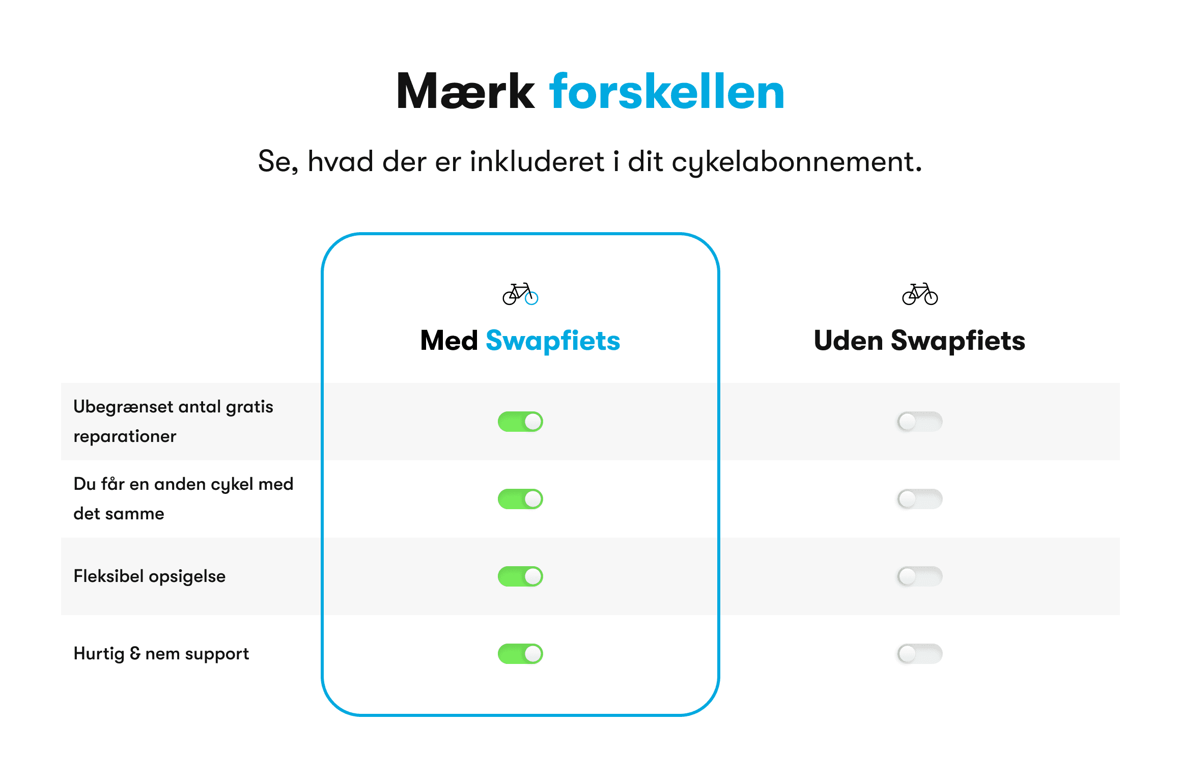 Vi ved godt, at det næsten lyder for godt til at være sandt. Men vi er ikke bange for at bevise det. Tag ikke bare vores ord for det. Book en gratis prøvetur i din nærmeste Swapfiets-butik, eller abonnér nu.